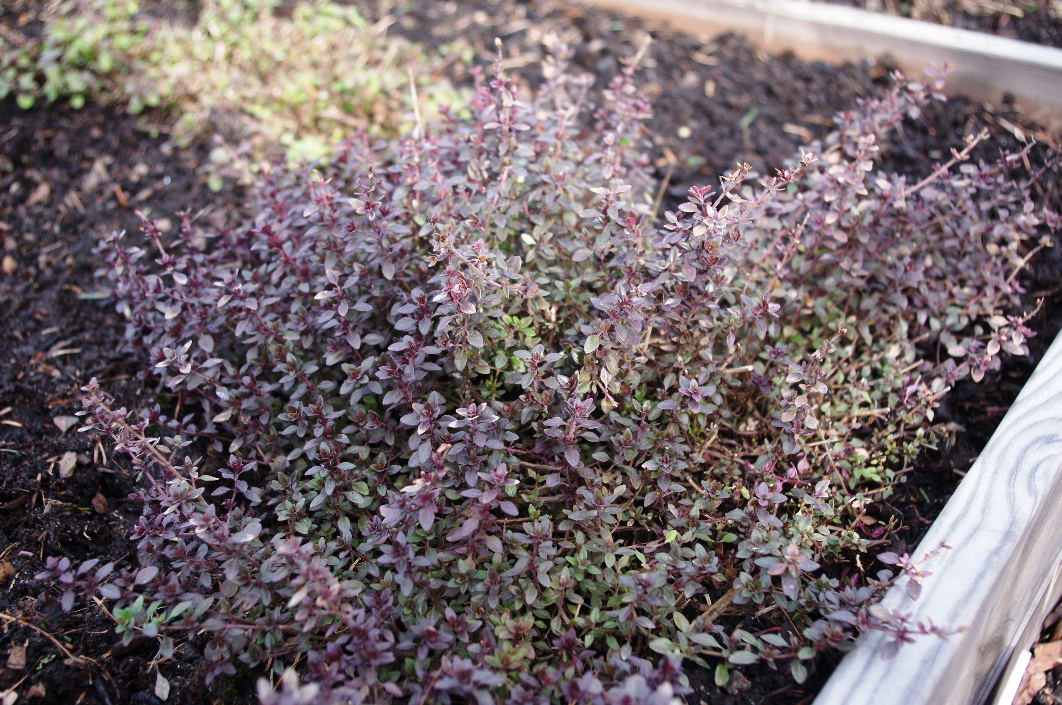 Oregano näyttää selvinneen talvesta erinomaisesti; uutta kasvua on jo näkyvissä. Samoin viime kesänä uutena lajina istuttamani sitruunatimjani on voimissaan. Se on tuuhea jo nyt, ja on muuttunut talven aikana tummanpunaiseksi. On kiinnostavaa seurata, vaihtuuko väri kevään mittaan takaisin vihreäksi.