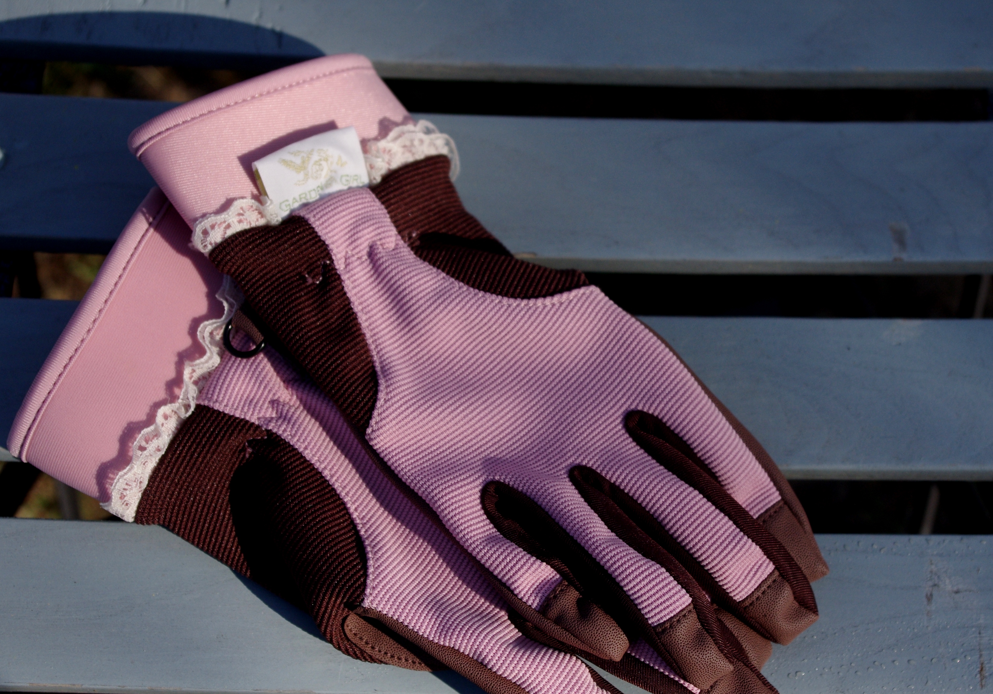 Löysin jo ensimmäiset, uuteen puutarhatyyliini sopivat Garden Girl-hansikkaat. Niissä on ihanasti pinkkiä ja pitsiä ja ohut kumimainen kämmenpuoli. Aivan mainiot, mielestäni.