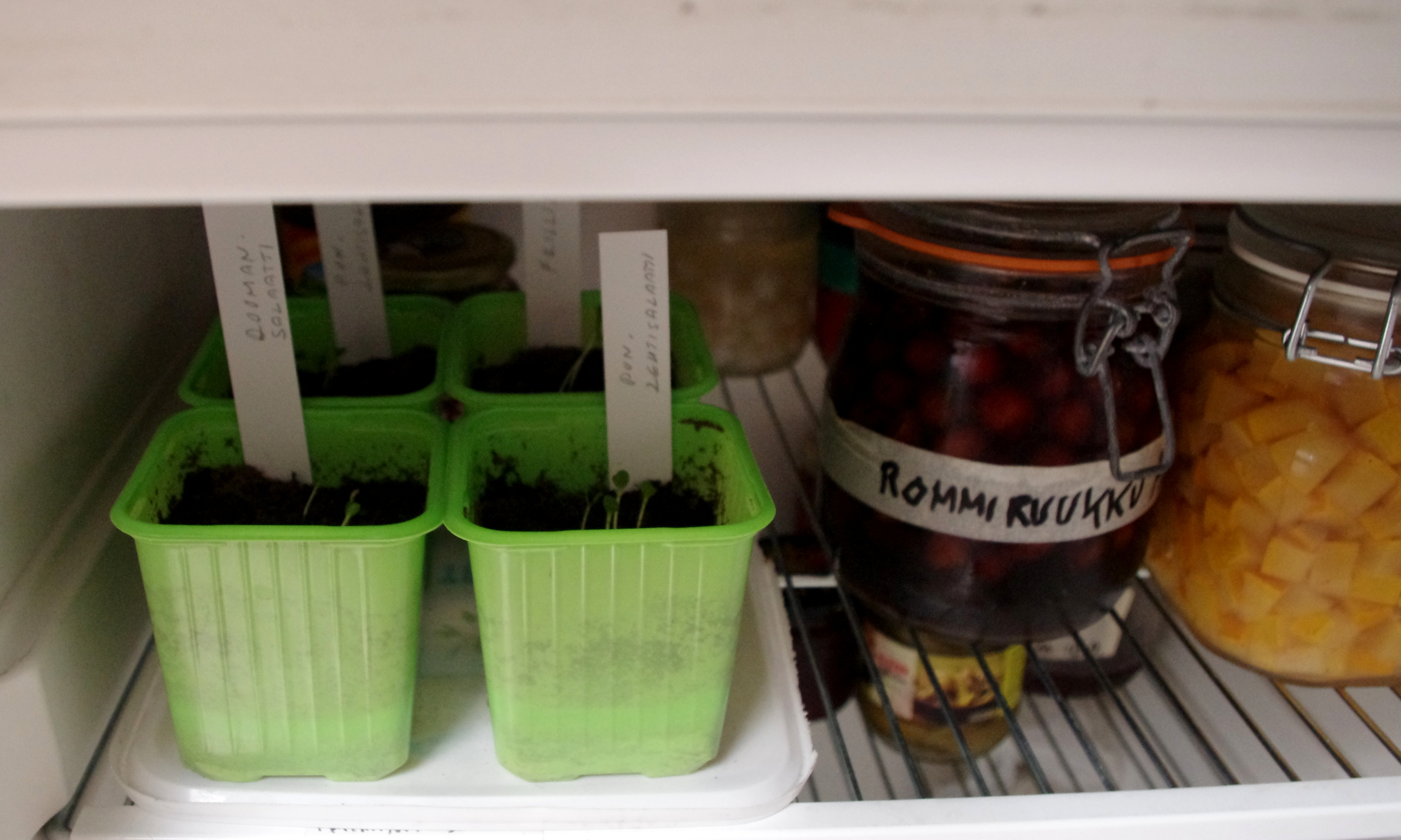 Meidän viileäkaapin ylähyllyllä lämpötila on suht koht tasaisesti 12 astetta. Vähän täyttä siellä on, mutta ainahan hillopurkit voi siirtää hetkeksi syrjään. Siispä salaatinsiemenet multaan ja purkit viileäkaappiin. Ja kas, muutamassa päivässä pintaan on noussut useampi pikku taimi uutta salaattia!