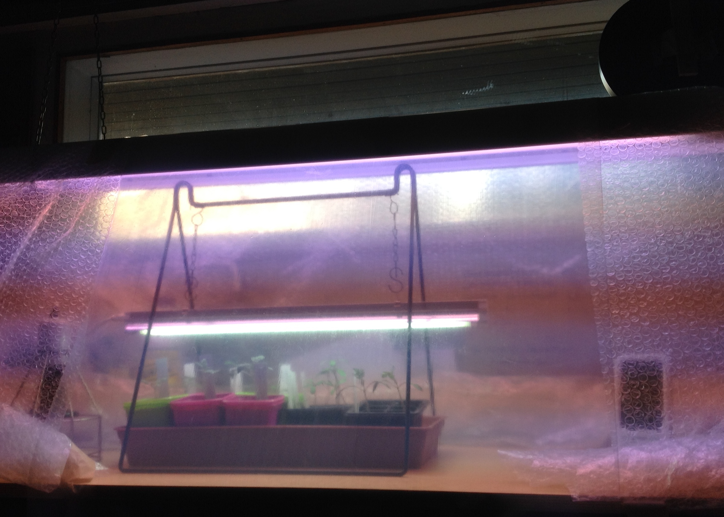 PS. 19.3.2015 Aamulla autotallin lämpötila oli laskenut 14 asteeseen, ja se on liian vähän. Viime keväänä minulla oli taimihyllyllä itse muovista kyhätty mininikasvihuone, jossa lämpötila lampppujen ansiosta pysyi sopivana. Rakennelma vain oli niin pieni, ettei siitä kauan ollut iloa. Nyt tein toisen version, missä kiinnitin 150 senttisen loisteputkivalaisimen ympärille kuplamuovia niin, että sisäpuolelle syntyi valaisimen pituinen suljettu tila. Lamppujen palaessa lämpötila muovin sisällä nousi heti 17 asteeseen.Yöllä se toki laskee, mutta terraariokäyttöön tarkoitettu lämpölamppu kuitenkin lämmittänee hieman.