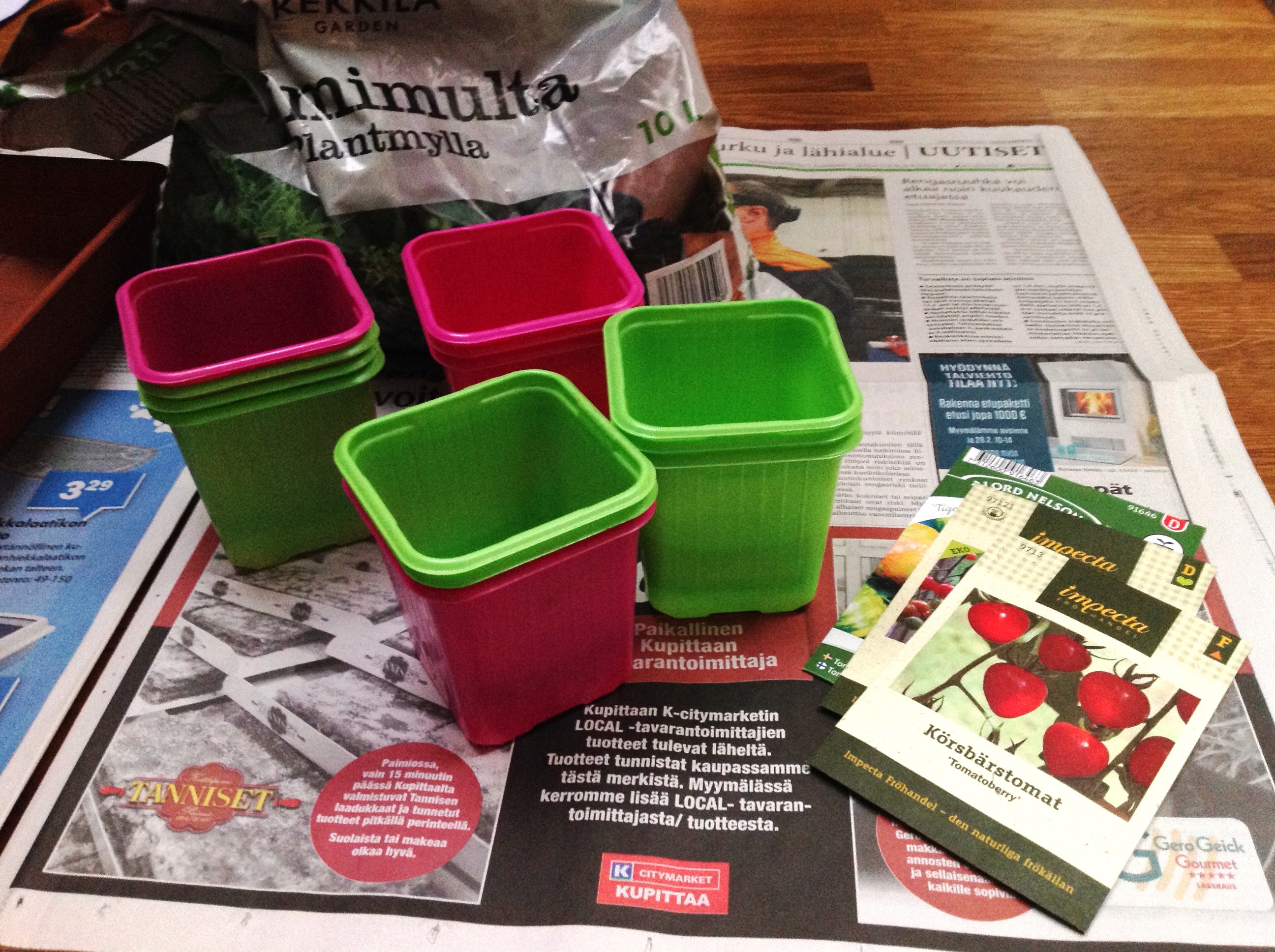 (18.3.) Joudun tänä vuonna olemaan maltillinen kylvöjen ja taimien kanssa, sillä viikon lomamatka huhtikuun alussa aiheuttaa ylimääräisiä hoitojärjestelyjä. En voi mielin määrin kylvää kaikkea ja sitten vaatia, että joku muu vastaa niiden hengissä pysymisestä. Sen takia kylvin vain kaikkein tärkeimmät, eli tomaatit, ja kylvän kesäkukat ym. vasta lomamatkan jälkeen.