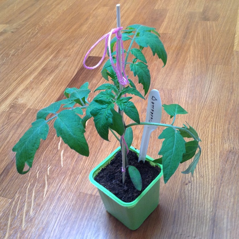 On mahdolista, että olen joskus ammoin saanut kerän edesmenneeltä äidiltäni jotakin unohduksiin painunutta tarkoitusta varten. Joka tapauksessa pinkki lankakerä on ollut meillä kauan. Ainakin koko sen ajan, minkä olen tomaatteja kasvattanut, eli toistakymmentä vuotta.