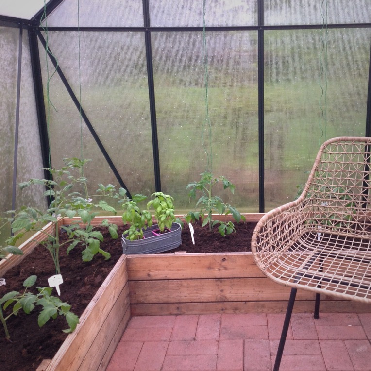 (14.5.) Lämpimistä päivistä huolimatta olen vielä lykännyt tomaattien istuttamista kasvihuoneeseen. Yöt ovat olleet sen verran kylmiä, että olen joka ilta kuljettanut tomaatit autotalliin ja aamulla taas takaisin kasvihuoneeseen. Melkoista edestakaisin puljaamista, ja helposti siinä tulee vaurioitakin, kun ovat niin isoja jo.