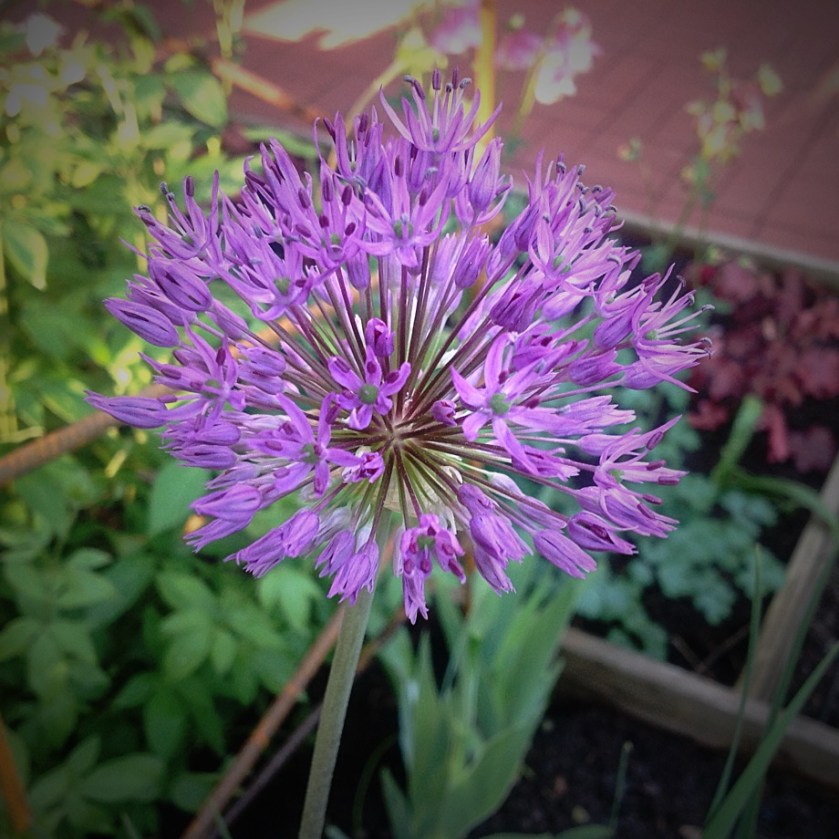 (2.6.) Jokin aika sitten ihmettelin, kun perennapenkissäni iiristen ja päivänliljojen seassa törrötti outo ilmestys. Pitkän varren päässä heilui laukkakasvin nupulta näyttävä pallukka.