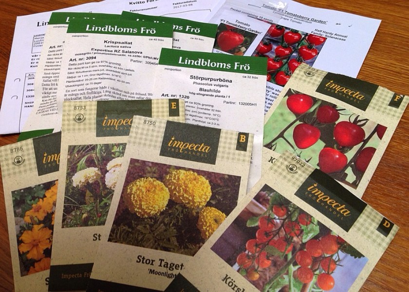 Tämän kevään kylvöihin löytyy kaikkia siemeniä riittävästi vanhastaan. Ei ole mitään tarvetta hankkia yhtään uutta siemenpussia. Olen tehnyt inventaarion, ja pärjään oikein hyvin näillä nykyisillä . On tosi hyvä, että nyt saan säilytyslaatikosta yli pursuavaa siemenvarastoa kerrankin edes hiukan pienemmäksi. Kyllä näin on.