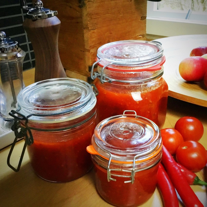 Aikani pähkäilin, mitä niille oikein tekisin, ja sitten keksin, että säilöttäväksi sopii vähän mauttomampikin tomaatti. Niinpä keitin niistä paholaisen hilloa, ja voi miten hyvää siitä tulikin!