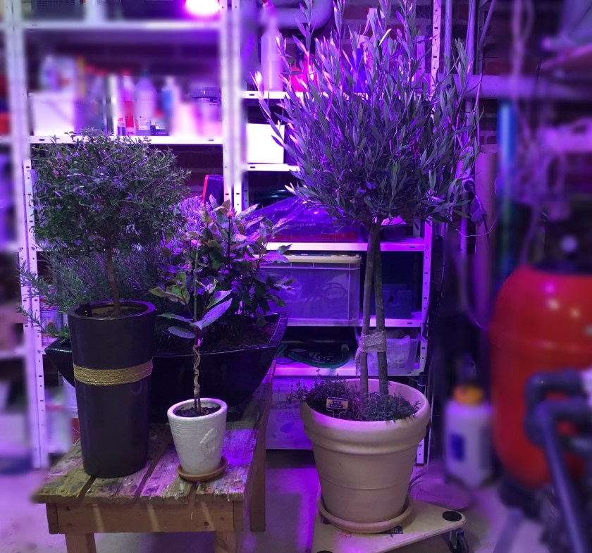 Ripustin autotallin kattoon kolme kasvilamppua ja sijoitin kasvit niiden alle. Oliivipuu on lattialla ja muut sain mahtumaan Perheenpään vanhan työpenkin päälle. Penkki on raakalaudasta krouvilla otteella itse nikkaroitu ja se on palvellut milloin missäkin työssä. Tehtiin vaihtokauppa: minä sain vanhan työpenkin, ja Perheenpää sai tilalle uuden ja hienon, kokoontaittuvan Boschin työtason.