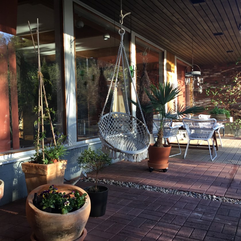 Oleskelupihan puolella kevään projekti oli terassin edustalla kituneen nurmikon korvaaminen sorapinnalla ja laattapolulla.