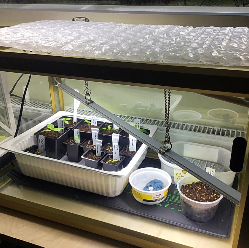 Sijoitin akvaarion työhuoneeseeni, missä taimien kasvua on mukava seurata töiden lomassa. Altaan pohjalla on Nelson Gardenin lämpömatto ja valaisemena saman valmistajan led-lista. Peitteenä on kuplamuovipala, jota on helpompi käsitellä kuin akvaarion omaa lasikantta. Olosuhteet akvaarion sisällä ovat ihanteelliset: ilma on kosteaa, lämpö 26 astetta ja valoa riittävästi. Tuuletus hoituu kuplamuovia raottamalla.