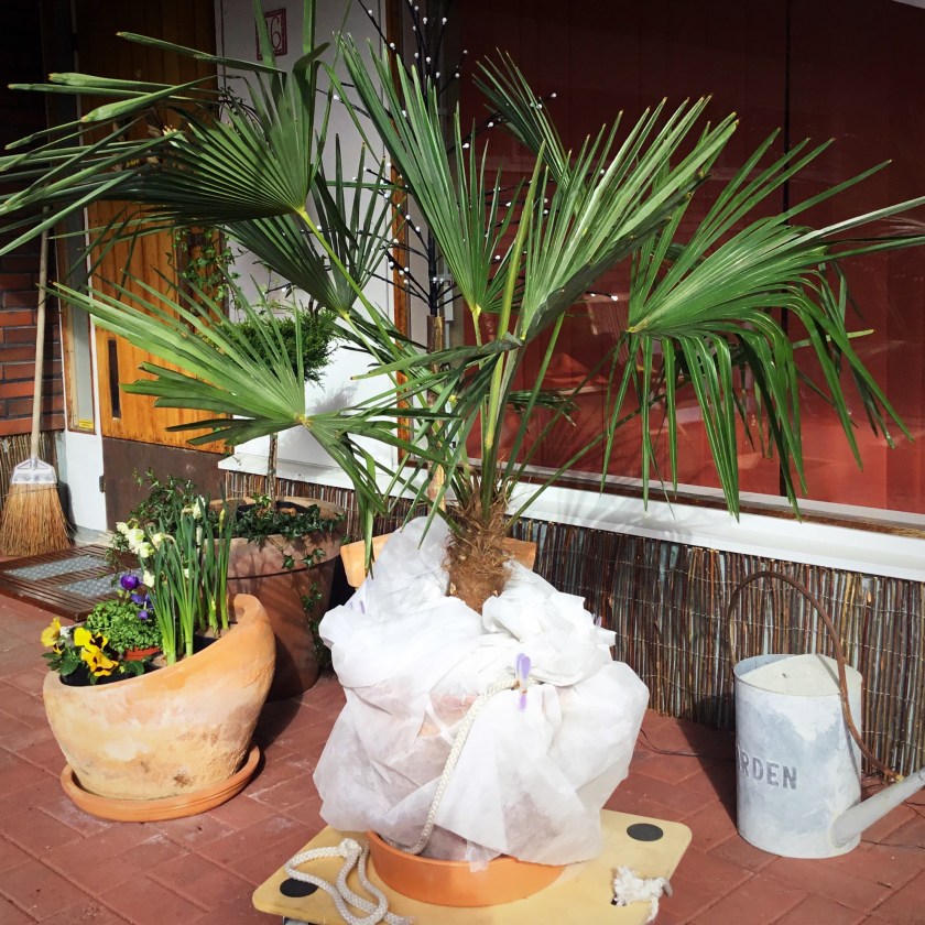 Autotallin asukkaista suurin ja painavin on kuitupalmu. Koska se kestää vähän pakkastakin, se siirrettiin viikonvaihteessa jo terassille omalle paikalleen. Yöksi sekin saa suojakseen vielä pakkaspeitteen. Siinä oli muutamia kuivuneita oksia ja lehtiä, mutta toivoakseni luonnonvalo auttaa sen parempaan kuntoon.