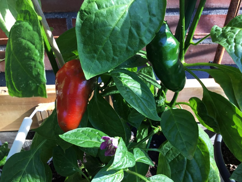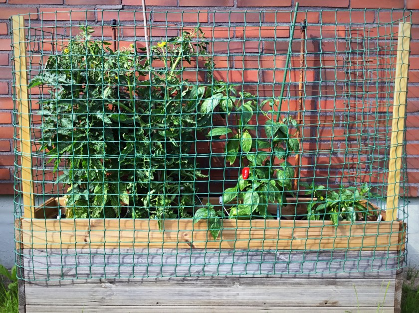 Chilit ovat omassa pienessä kasvihuoneessaan ja hyvässä kasvussa nekin. Istutin chilit tänä vuonna Orthexin altakasteluruukuihin, isoin on halkaisijaltaan 30 senttiä, pienin 20. Lisäksi Rocoto Montufar ja Hungarian Hot Wax ovat ulkokasvatuksessa talon eteläseinustalla, kuten myös tomaatit New Big Dwarf ja Nepal. Ulkona oleville tuunattiin altakasteluruukut 25 litran riuttasuolaämpäreistä. Ämpäreiden sisälle sijoitettiin Elhon 13 litran sisäruukut, ja vesitilaksi jäi noin seitsemän litraa. Se on laiskalle kastelijalle aika mukavasti. Ämpärit ovat puisen penkin sisällä, sillä mitään kaunistuksia ne eivät ole. Kauriiden varalta penkki on suojattu verkolla.