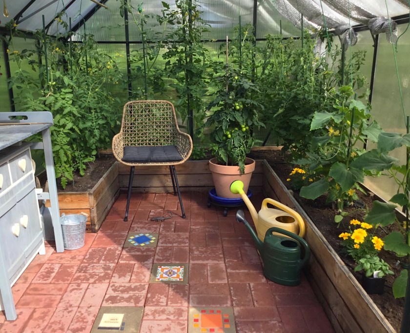 Kasvihuoneessa on jo kesämoodi päällä, eli taimikasvatusvaiheen ja autotallista sinne siirrettyjen Välimeren kasvien jälkeen siellä on nyt vain tomaatit ja kurkut. Plus tietysti vähän basilikaa ja pari samettiruusua.