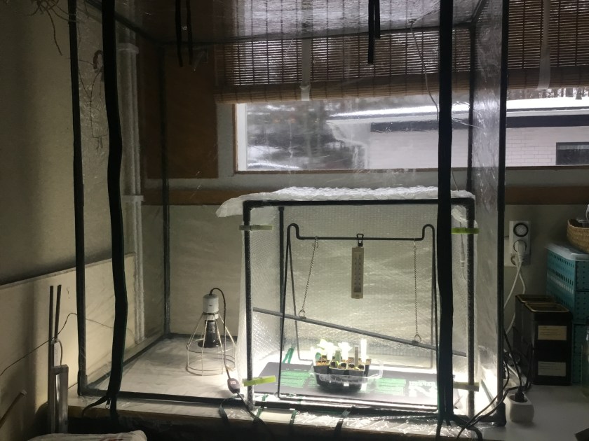 Pystytin varastohuoneen pöydälle taimikasvatusta varten uuden kasvatuslaitoksen. Hankin Bauhausista pienen muovikasvihuoneen ja eristin sen sisälle kuplamuovilla vielä pienemmän tilan aivan alkuvaiheeseen. Lämpömatto ja pieni 60 watin terraariolämmitin pitävät lämpötilan noin 25 asteessa. Valaistuksena minulla on Nelson Gardenin leditankoja, joita ripustetaan lisää taimikasvatuksen edetessä. Kokosin muovihuoneen vain metrin korkuisena, niin se toimii pöydän päällä. Korkeus riittää taimivaiheeseen silti hyvin.