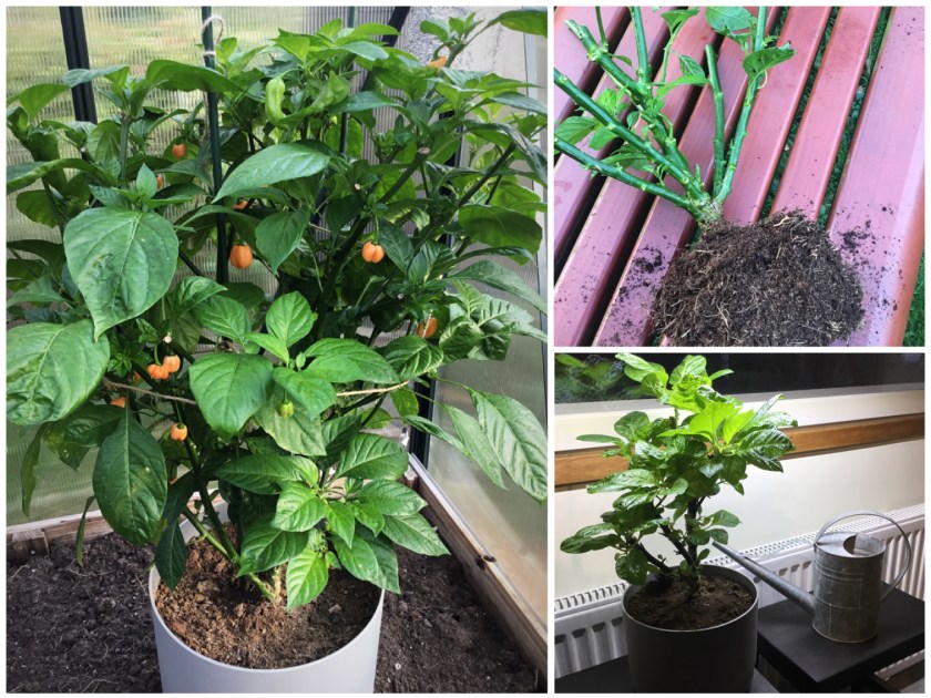 Ensimmäistä kertaa yritän myös talvettaa chiliä. Edellä mainittu Pink Habanero on maultaan mieluisa, se on mieto ja mehevä. Lisäksi kovin kaunis kiiltävine lehtineen. Podeja tuli aika myöhään ja osa niistäkin oli hyvin pieniä. Sen takia päätin kokeilla talvettamista, josko toisen vuoden kasvista saisi aikaisemmin ja isompaa satoa.
