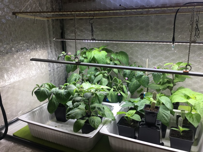 Rocotot ja chinenset tekevät koko ajan uusia kukkia; jopa kaikkein pienin, vasta tammikuun puolivälissä kylvetty Biquinho. Olen niitä hiukan nyppinyt pois, mutta taidan tästä eteenpäin antaa kukkia vaan. Pianhan ne pääsevät kasvihuoneeseen parempaan valoonkin. Baccatumeissa ei ole vielä nuppuja näkynyt.