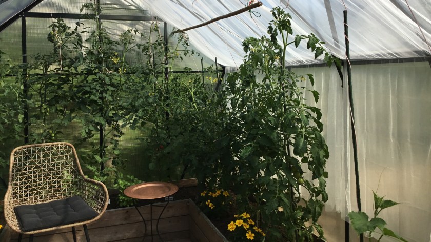 Elokuun runsaammat sateet sitten korjasivat tilannetta avomaallakin. Juureksia lukuun ottamatta kasvimaan sato muodostui kaiken kaikkiaan kohtalaiseksi: salaatit, pavut ja valkosipuli kasvoivat hyvin, kesäkurpitsaa tuli liiaksikin. Palmukaali kasvaa edelleen rehevänä. Tomaatteja saatiin kesäkuun lopusta alkaen yllin kyllin, ja niitä on kasvihuoneessa kypsymässä runsaasti edelleen. Ensin kypsyivät pienet kirsikkatomaatit; Tomatoberry ja Artisan Blush Tiger etunenässä. Isommat Jaune Flamme ja Perfect Flame seurasivat ja viimeisenä tuli Dark Galaxy.