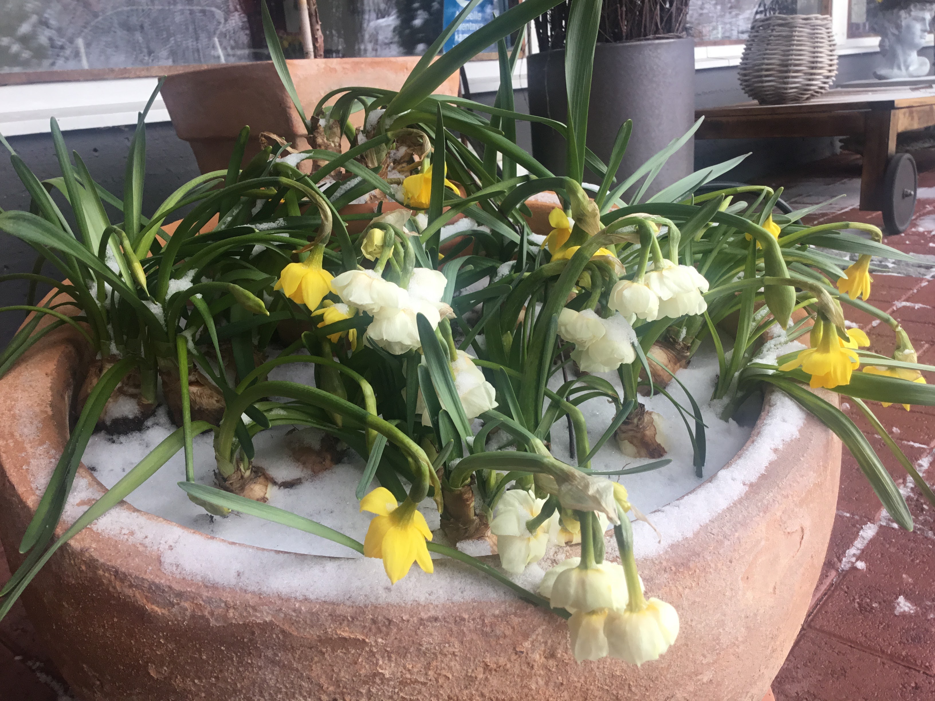 No, nyt saamme uudelleen odottaa lumien sulamista ja varautua siihen, että kaikki narsissit eivät tuolta lumen alta ehkä enää nouse. Mutta taimet saavat nyt kaikesta huolimatta pysyä taimihuoneessa. Enhän niitä sieltä lumituiskussa oikein voisi pois kuljettaakaan. Lämpöpuhaltimen termostaatti on säädetty 13 asteeseen, ja kun aurinko ei paista, ei lämpötila tuosta juuri nouse päivälläkään. Onneksi reilun neliön kokoisen kopin lämpimänä pitämiseen ei tarvita kovin paljon sähköä. Aikaisempina vuosina sähköä on kulunut vajaassa kahdessa kuukaudessa noin 25 euroa.