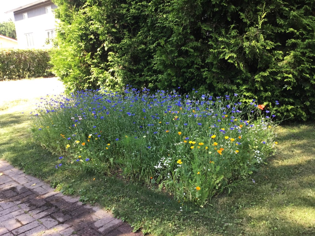 Viime keväänä perustimme pihalle myös pienen kukkaniityn. Se tehtiin valmiista Kukkaniitty-siemenkankaasta, koko noin viisi neliömetriä. Se oli vähän pettymys, koska lajitelma oli melko yksipuolinen. Pääasiassa siinä kasvoi ruiskukkaa, vähän kehäkukkaa ja muutamia unikkoja. Lisäksi oli jotain hyvin rotevakasvuista kosmoskukkaa. Ne eivät koskaan ehtineet kukkaan asti, ja syksyllä kiskoimme ne kokonaan pois. Nyt Perheenpää laajensi niittyalueen tuplaksi, ja kylvin siihen uuden kotimaisen Perhosniitty-seoksen. Lisäksi ripottelin sekaan vähän tulppaani- ja silkkiunikkoa sekä punapellavaa. Lisäsin samoja siemeniä hiukan myös viime kesänä perustetulle alueelle.