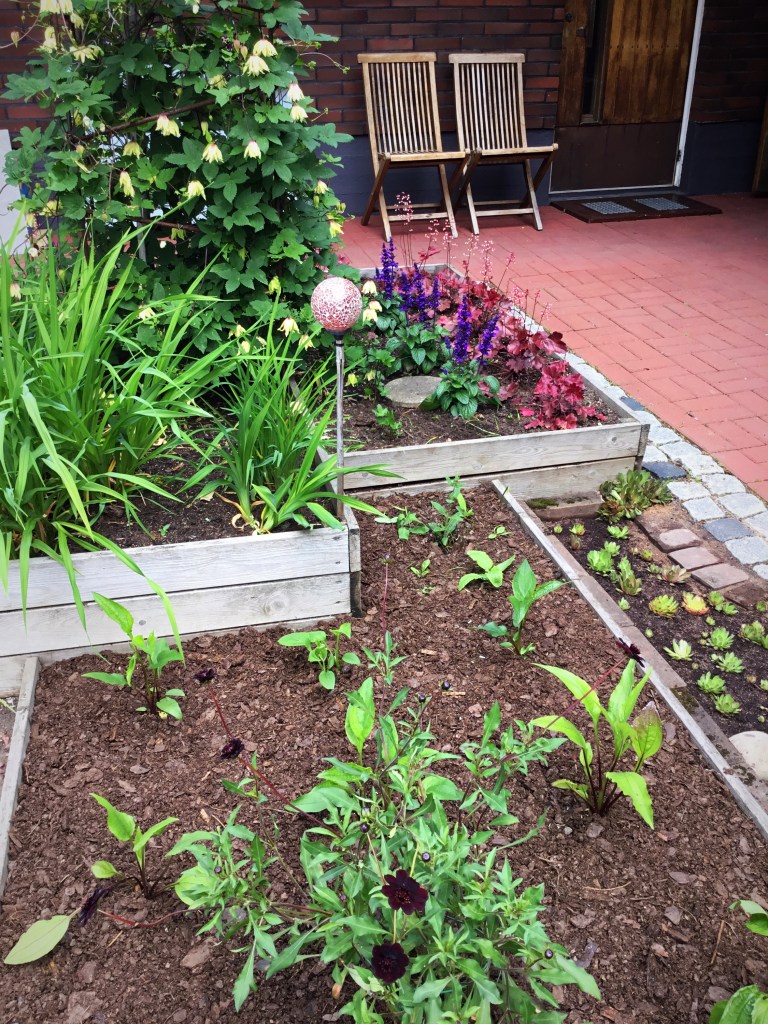Harmillisin menetys oli kaunopunahatut. Niitä on ollut aika monta ja useita eri lajeja, mutta talvesta selviytyi vain neljä pientä itsekseen kylväytynyttä taimea. Niiden lajeista ei vielä ole tietoa. Ostin paikalliselta puutarhalta uusia taimia, koska ehdottomasti haluan pitää kaunopunahattuja jatkossakin. Iso karmiininpunainen ’Magnus’ (70 – 100 cm) on ollut suosikkini ja sitä löytyi nytkin. Lisäksi tarkempaa lajimäärittelyä vailla oleva valkoinen, noin 60 sentin korkuiseksi kasvava lajike, ja itselleni uusi vadelmanpunainen ’Kismet Rasberry’ (35 – 50 cm). Aika väljältä punahattupenkki nyt näyttää, mutta josko uudet taimet tuosta lähtisivät hyvään kasvuun. Kaunopunahattujen seassa kasvaa kolme suklaakosmosta, jotka tuovat vähän väriä ja rehevyyttä.