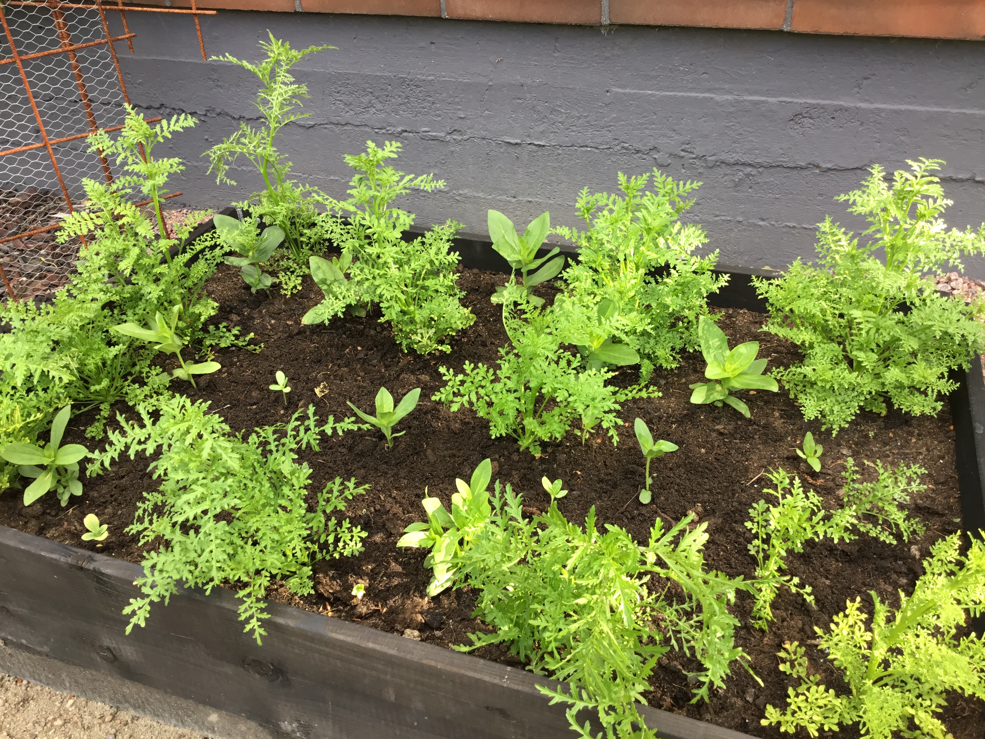 Tänä kesänä minulla on ensimmäistä kertaa kesäkukkapenkki. Kylvin huhtikuussa suoraan lavaan zinniaa ja kirjoperhoskukkaa. En ole kasvattanut kumpaakaan aikaisemmin eikä minulla ollut tietoa niiden kasvutavoista. Minua fiksumpi ihminen olisi ehkä ottanut selvää… Kylvin siemeniä sikin sokin ja aika tiheästi, koska onhan ne nyt tosi pieniä ja aina osa jää itämättä. Niin varmaan jääkin, mutta siitä huolimatta 80 x 120 sentin lavaan ei tarvitse kovin monta siementä.