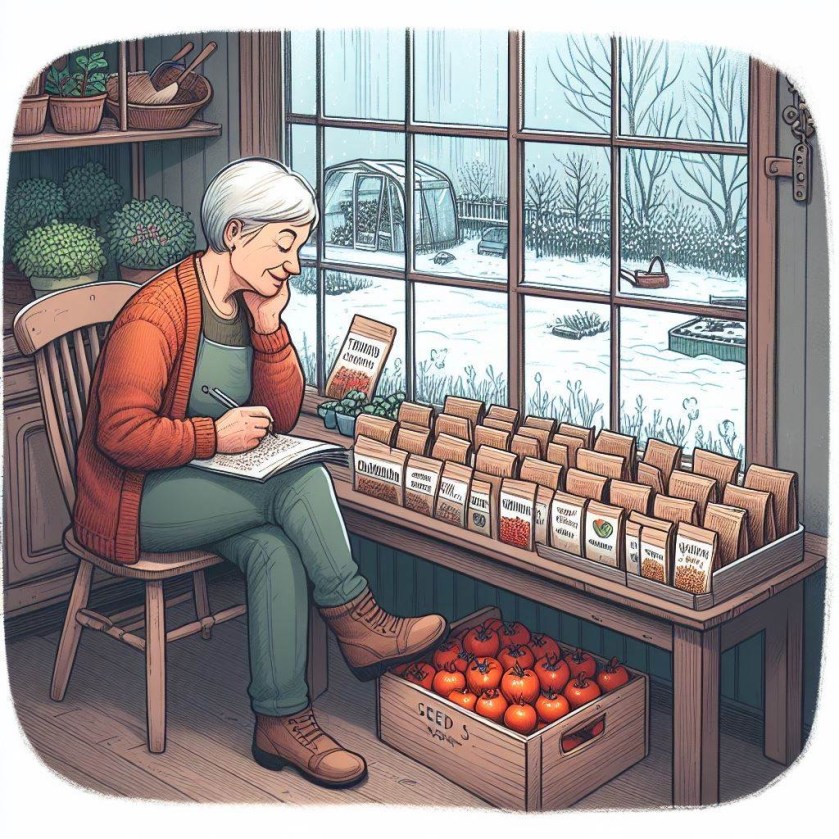 Tekoälyn minulle luoma piirros vanhemmasta naisesta, joka miettii, millaisia tomaatteja kasvattaisi.