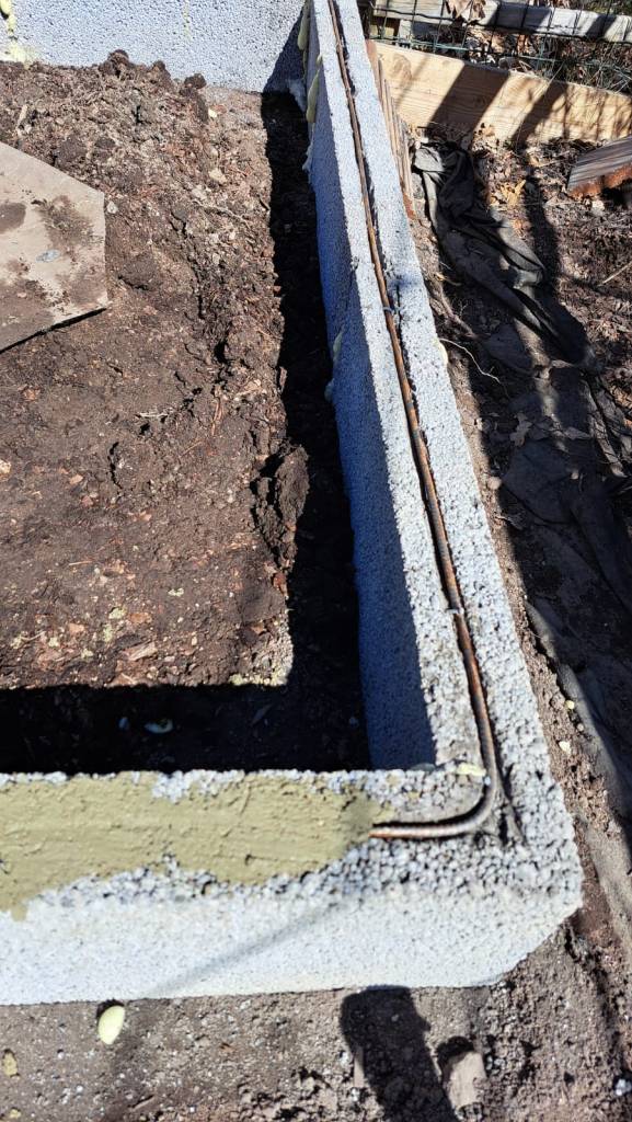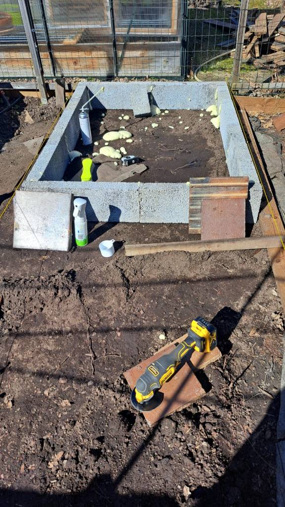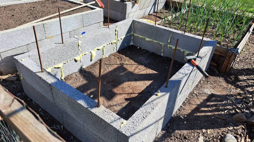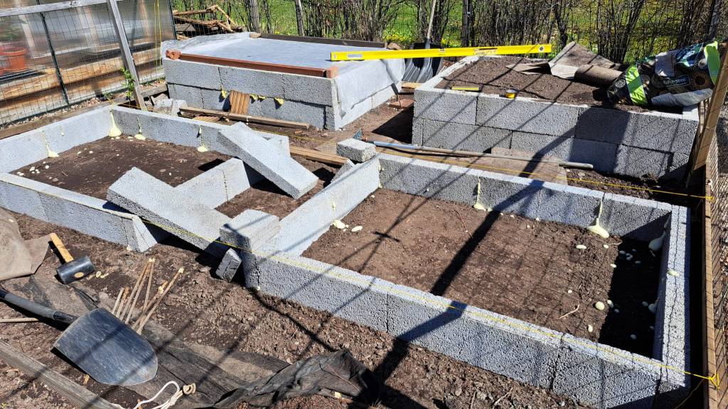 Maaperä täällä on savista, ja varman päälle pelaaminen olisi tietysti edellyttänyt penkeille kunnon perustuksia. Päädyimme kuitenkin latomaan harkot suoraan maan pinnalle, sillä routarajan alle kaivaminen ja perustusten valaminen tuntui tässä yhteydessä ylimitoitetulta. Kyseessä on kuitenkin vain kasvimaan penkki, ei mikään rakennus. Aika näyttää, miten tuo toimii.