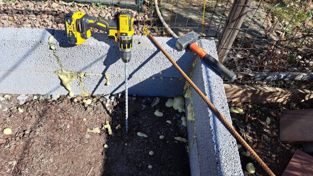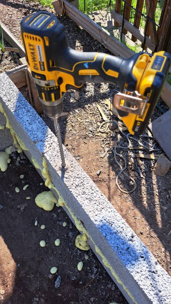 Toisen kerroksen harkot kiinnitettiin sekä pohjakerrokseen että toisiinsa samalla kiviliimalla. Sen kuivuttua molempien harkkokerrosten läpi porattiin 12 mm reiät, joihin työnnettiin 75 senttiä pitkät 10 mm harjateräkset maahan asti. Rautoja tuli kaksi jokaiselle sivulle, eli yhteensä kahdeksan per penkki. Se varmistaa penkin pysymisen koossa pystysuunnassa. Sen jälkeen toisen kerroksen pintaan jyrsittiin ura ja kiinnitettiin kehä betoniraudasta samoin kuin ensimmäisellä kerroksella. Lopuksi myös toisen kerroksen ura täytettiin ja pinta tasoitettiin laastilla.