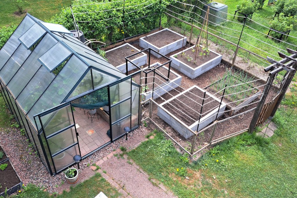 Niinpä päätimme materiaalin lisäksi muuttaa myös penkkien kokoa ja asettelua. Entisen kolmen tilalla on nyt kuusi penkkiä, joiden koko on noin 1,6 x 1,2 metriä, korkeutta on noin 40 senttiä. Kulkuväylä on penkkien keskellä, suoraan sisäänkäynnin kohdalla. Sen leveys on 65 senttiä, ja jatkossa kasvimaalle pääsee helposti myös kottikärryillä.