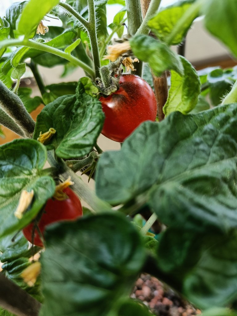 Pikkukääpiöt ovat kasvaneet periaatteessa hyvin. Ensimmäiset kukat avautuivat lokakuun alussa, ja loppukuussa näkyi jo raakileita. Olen aina muistaessani ravistellut kukkavarsia pölyttymisen varmistamiseksi, ja raakileita onkin tullut paljon lisää. Kovin hitaasti ne vain tuntuvat kypsyvän, enkä ole vielä päässyt maistamaan yhtäkään. Kunhan kypsyvät, epäilen, ettei maku ole verrattavissa kesällä auringonpaisteessa kasvaneisiin. Mutta sehän ei olekaan tärkeintä, vaan pääasia on kasvattamisen ilo.