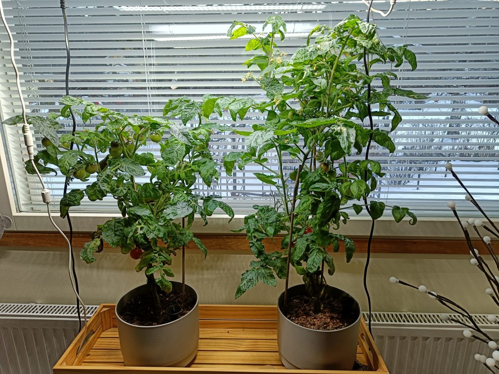 Tomaatit kasvavat tavallisessa mullassa Orthexin 20-senttisissä Pauliina-altakasteluruukuissa. Vähän pieniltä ruukut jo näyttävät, ja varsien tukeminen on hankalaa. Multatila on niin matala, etteivät tukikepit tahdo pysyä tukevasti pystyssä niissä. Mutta eiköhän niillä nyt kevääseen asti pärjätä, ja sitten onkin jo uusien taimien vuoro.