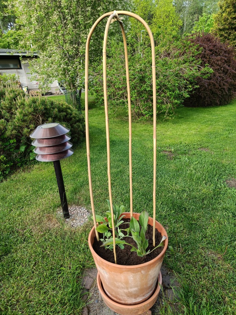 Laitoin tuoksuhernettä myös perennapenkissä kasvavan tarhalyhtykärhön ympärille. Kärhö on viime kesänä istutettu ’Princess Kate’ ja vielä aivan rääpäle. Neliön mallisen köynnöskehikon kulmiin ristikkäin istutetut kaksi Mammothia ja kaksi Royalia saavat nyt tuoda vähän runsautta prinsessallekin.