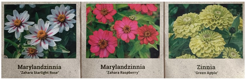 Zinnioita olen kasvattanut jo useampana vuotena. Yleensä olen käyttänyt erilaisia valmiita siemensekoituksia, joista on sitten tullut milloin mitäkin. Tänä vuonna hankin kuitenkin erikseen kolme lajiketta: noin 40-senttiseksi kasvavat loistozinniat Zahara Starlight Rosen ja Zahara Raspberryn ja 50-senttisen isozinnia Green Applen.
