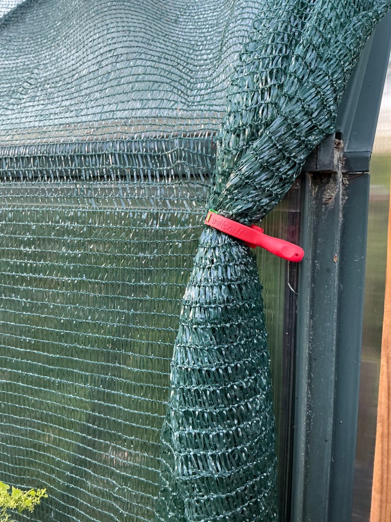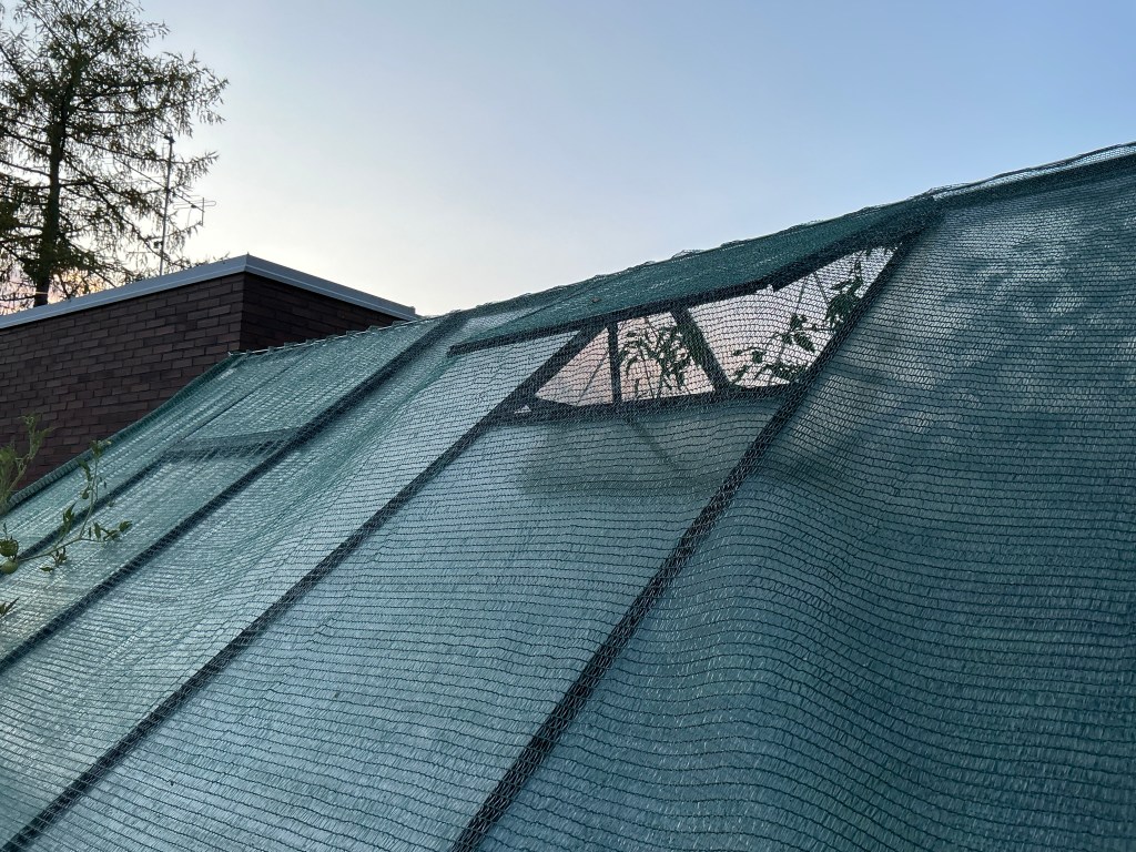 Keväällä sain älynväläyksen, että kasvihuoneen ulkopuolella oleva varjostusverkko voisi toimia sisällä olevia verhoja tehokkaammin. Silloin ainakin osa lämmöstä jäisi kokonaan ulkopuolelle eikä tunkeutuisi sisälle kuumentamaan katon ja verhon välissä olevaa ilmaa.