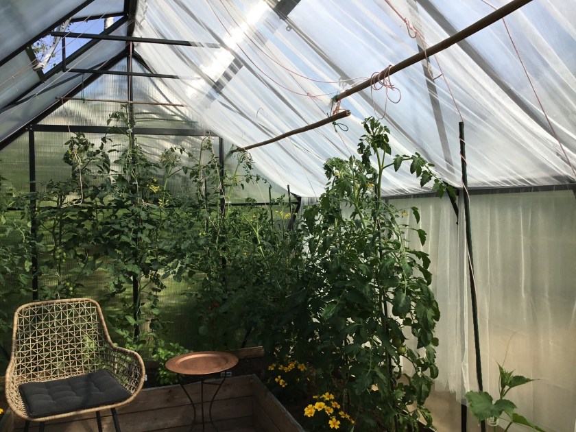Minulla on ollut Ikean valkoiset harsoverhot, jotka olen ripustanut kasvihuoneen eteläseinustalle kattoon ja kiinnittänyt katon ja seinän taitteeseen. Ne ovat olleet mielestäni hyvin kauniit, mutta myös jossakin määrin hankalat. Niiden siirtäminen syrjään korkeiden tomaattien ja kurkkujen takaa on vaikeaa, ja lisäksi kurkkujen kärhet takertuvat niihin ikävästi.