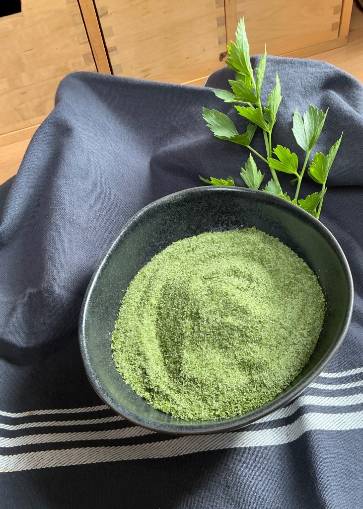 Laitoin ensin pelkät lehdet teholeikkuriin ja rouhin karkeaksi silpuksi, niin että määrä tiivistyi noin kolmannekseen, eli 2,5 desiin. Lisäsin 1 dl hienoa merisuolaa ja annoin koneen käydä, kunnes kaikki oli sekaisin ja tasaista. Lopputuloksena oli 1,5 dl kauniin vihreää ja ihanan tuoksuista lipstikkasuolaa.