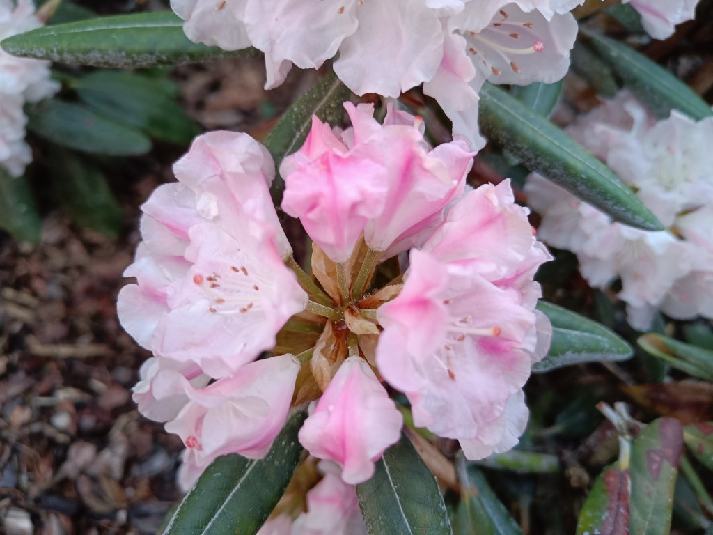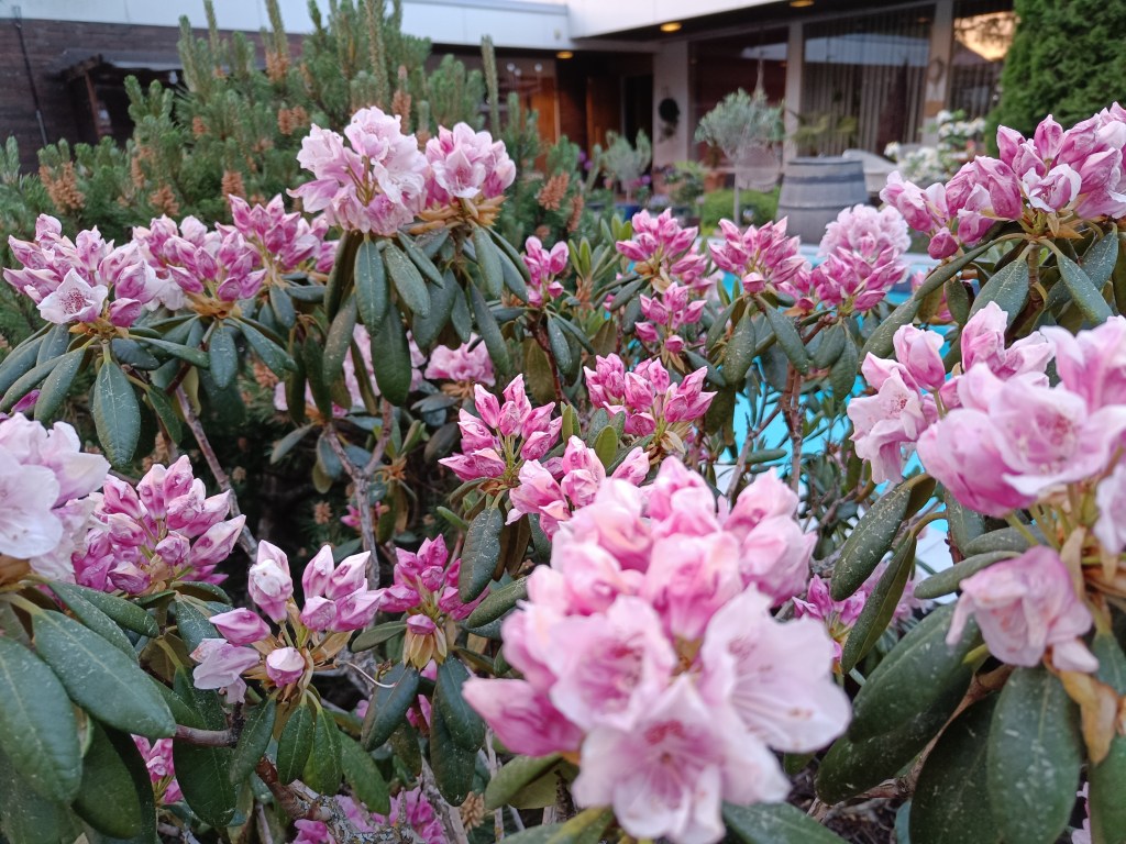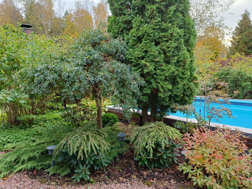 Yakushiman alppiruusu ’Kullervo’ on samalta vuodelta. Se on alhaalta melko kalju, mutta muuten tasainen ja kukkii pitkään ihanin lähes valkoisin kukin. Royal alppiruusu ’Royal Rosy’ on istutettu vuonna 2017. Kauris on käynyt sitä joskus haukkaamassa, mutta siitä huolimatta se on melko elinvoimainen ja tuuhea. Sekä Kullervo että Royal Rosy saivat havukodan ylleen.