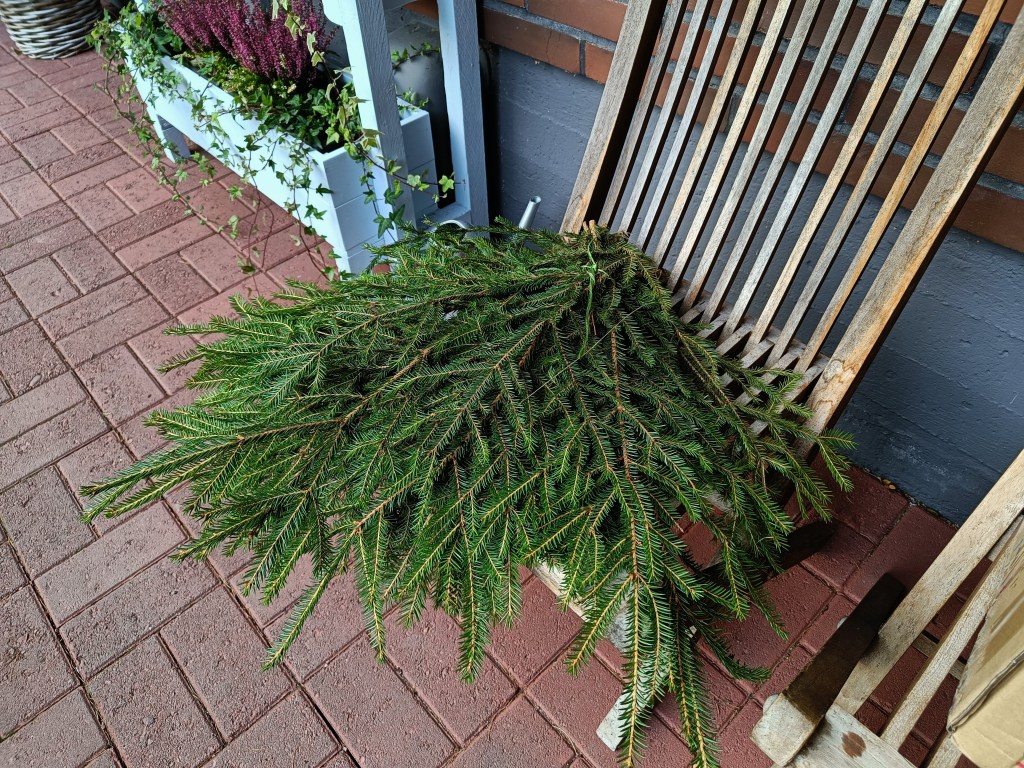 Tänä syksynä kehitin havujen kiinnittämiseen helpomman tavan. Kun metallikaaret olivat paikoillaan maassa, kiinnitin niiden päälle nippusiteillä noin 50 x 50 sentin kokoisen palan vihreää kanaverkkoa. Havut oli sen jälkeen tosi helppo kiinnittää verkkoon eikä avuksi tarvittu mitään naruja tai nippusiteitä. Riitti, kun pujotti oksien päät verkon silmien läpi. Oksat pysyvät hyvin paikoillaan, ja havukota näyttää paljon paremmalta kuin viime vuonna. Tarvittaessa havuja voi myös helposti laittaa lisää, jos siltä alkaa näyttää.