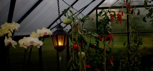 Kasvihuoneessa on ihanan hämyisää kynttilän valossa. Juuri ennen pimeää kynttilä luo kaunista tunnelmaa. Ja lämmittääkin hiukan!