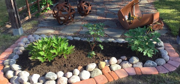 Yksittäinen Itoh-pioni -istutukseni laajeni tänä kesänä oikeaksi pieneksi pionipenkiksi. Itoh-pionit ovat ruohovartisten ja puuvartisten pionien risteytyksiä. Ne ovat pystyjä ja jäykkävartisia, mutta varret eivä talvehdi.